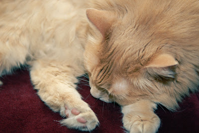 This pic is from last weekend. It's film and I develop and scan my film myself, so that's why it's an older pic, but it's the same as this past weekend. Cats love to take afternoon naps and Queso's no exception.